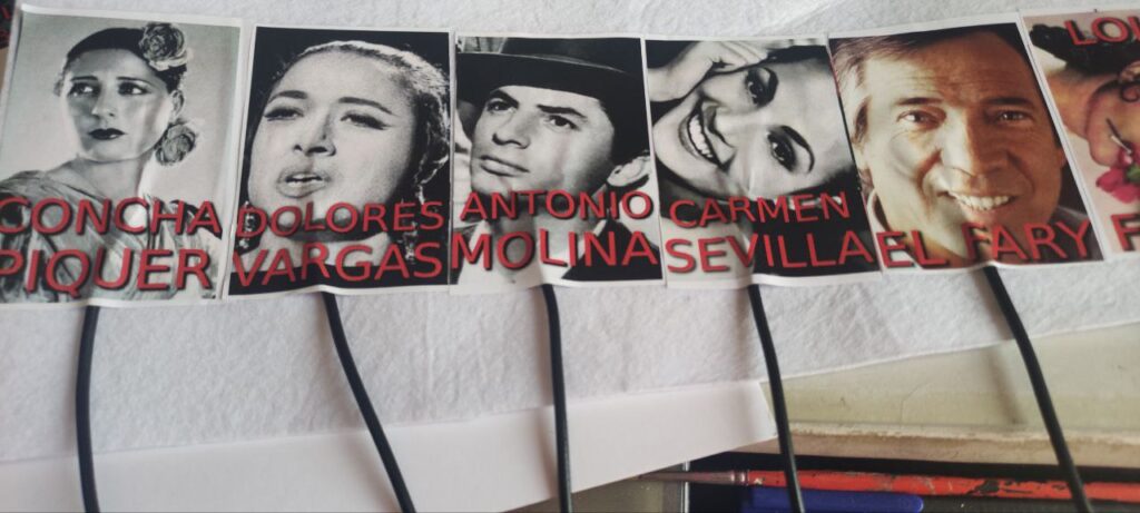 Aqui teniu un altre exemple de botons tàctils. S’ha utilitzat un cable una mica gruixut i cinta adhesiva de coure. Les imatges dels cantants s’han imprès sobre paper adhesiu. Ordre dels elements: base, cinta adhesiva de coure, fils del cable en forma de vano, imatge retallada en paper adhesiu del cantant.