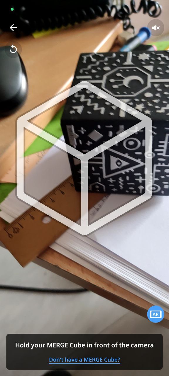 - Apuntar la càmera del dispositiu cap al Merge Cube, alineant-lo amb la silueta que apareixerà a la pantalla.